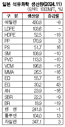 일본은 2024년 11월 에틸렌 생산량이 43만800톤으로 전년동월대비 8% 감소했고 1-11월 생산량은 452만톤으로 7% 줄어 1-12월 전체적으로 500만톤을 넘지 못할 것으로 판단된다.