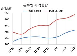 톨루엔(Toluene)은 상승했다. 톨루엔 시세는 1월17일 FOB Korea가 톤당 815달러로 20달러, CFR SE Asia는 845달러로 15달러 상승했다. CFR China는 800달러로 40달러, CFR India는 915달러로 15달러 올랐다. |