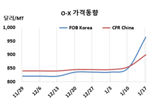 O-X 시세는 1월17일 FOB Korea가 톤당 965달러로 115달러 급등했고, CFR SE Asia는 910달러로 45달러 상승했다. CFR China도 900달러로 45달러 올랐다. 유럽은 FOB Rotterdam 1100달러로 변동이 없었다. FOB Korea는 8월16일 990달러를 형성한 이후