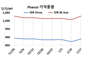 페놀(Phenol)은 상승했다. 페놀 시세는 1월17일 CFR China가 톤당 890달러로 15달러, CFR SE Asia는 1030달러로 20달러 상승했다. |