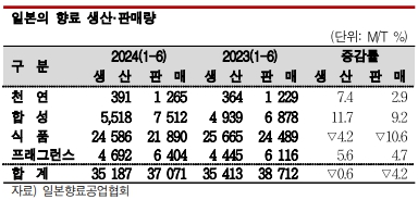 2024년 상반기에도 2023년과 같은 흐름을 유지한 것으로 파악된다. 합성향료는 5500톤으로 전년동기대비 11.7% 증가해 호조를 이어간 반면, 식품향료는 2만4500톤으로 4.2% 감소했다. 프래그런스는 4600톤으로 5.5% 늘었다.