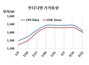 부타디엔(Butadiene)은 하락했다. 부타디엔 시세는 2월21일 FOB Korea가 톤당 1400달러로 60달러, CFR SE Asia는 1350달러로 50달러 하락했다. 중화권은 CFR China는 1420달러로 70달러, CFR Taiwan은 1410달러로 50달러 떨어졌다. |