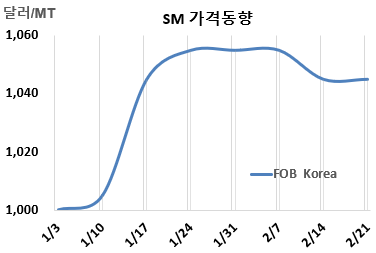 SM(Styrene Monomer)은 동남아가 상승했다. SM 시세는 2월21일 FOB Korea가 톤당 1045달러로 변동이 없었고, CFR SE Asia는 1085달러로 10달러 상승했다. CFR China는 1055달러, CFR Taiwan은 1085달러로 보합세에 그쳤고, CFR India는 1095달러로 5달러 올랐 |