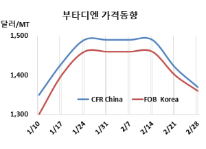 부타디엔 시세는 2월28일 FOB Korea가 톤당 1360달러로 40달러, CFR SE Asia는 1300달러로 50달러 하락했다. 중화권은 CFR China는 1370달러로 50달러, CFR Taiwan은 1370달러로 40달러 떨어졌다.