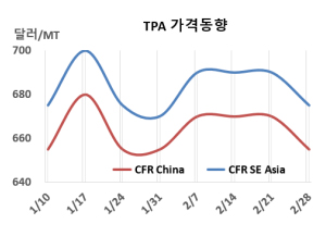 PTA(Purified Terephthalic Acid)는 하락했다. PTA 시세는 2월28일 CFR China가 톤당 655달러, CFR SE Asia는 675달러로 각각 15달러 하락했다. CFR India는 725달러로 20달러 떨어졌다. |