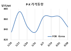 P-X(Para-Xylene)는 하락했다. P-X 시세는 2월28일 FOB Korea가 톤당 845달러, CFR SE Asia는 865달러로 각각 20달러 하락했다. CFR Taiwan은 865달러로 25달러 떨어졌다. 유럽도 FOB Rotterdam 865달러로 15달러 하락했다. |