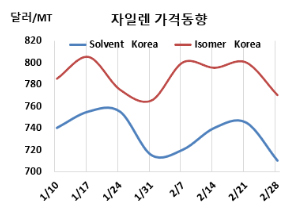 M-X(Mixed-Xylene)는 하락했다. 용제(Solvent) 그레이드 M-X 시세는 2월28일 FOB Korea가 톤당 710달러로 35달러, CFR SE Asia는 775달러로 20달러 하락했다. CFR China는 755달러로 30달러, CFR India는 790달러로 35달러 떨어졌다. |
