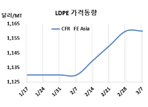 LDPE 시세는 3월5일 CFR FE Asia가 톤당 1160달러, CFR SE Asia는 1180달러로 변동이 없었다. CFR India도 1175달러로 보합세에 그쳤다. 유럽은 3월7일 FD NWE 1280유로로 변동이 없었다.