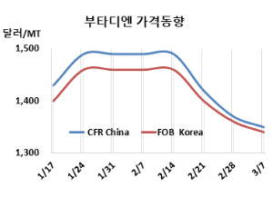 부타디엔(Butadiene)은 하락했다. 부타디엔 시세는 3월7일 FOB Korea가 톤당 1340달러로 20달러 하락했고, CFR SE Asia는 1300달러로 변동이 없었다. 중화권은 CFR China는 1350달러로 20달러, CFR Taiwan은 1360달러로 10달러 떨어졌다. |
