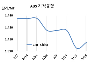 ABS(Acrylonitrile Butadiene Styrene)는 상승했다. ABS 시세는 3월26일 CFR China가 톤당 1405달러, CFR SE Asia는 1420달러로 각각 10달러 상승했다. CFR S Asia는 1425달러로 변동이 없었고, 유럽 시장은 3월28일 FD NWE 톤당 1820유로로 20유로 상승했다. |