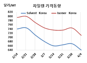 M-X(Mixed-Xylene)는 하락했다. 용제(Solvent) 그레이드 M-X 시세는 4월11일 FOB Korea가 톤당 635달러로 5달러, CFR SE Asia는 695달러로 45달러 하락했다. CFR China는 690달러로 20달러, CFR India는 |