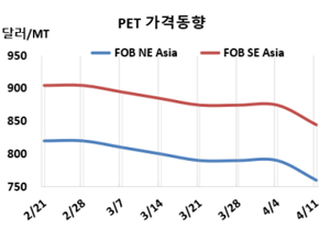 병(Bottle) 그레이드 PET 시세는 4월16일 FOB NE Asia가 735달러로 25달러, FOB SE Asia는 825달러로 20달러 하락했다. CFR S Asia는 785달러로 10달러 떨어졌다. 유럽은 4월18일 FD NWE가 톤당 1010유로로