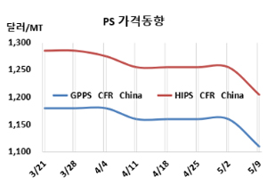 PS(Polystyrene)는 하락했다. GPPS(General Purpose PS) 시세는 5월7일 CFR China가 1110달러로 50달러, CFR SE Asia는 1130달러로 50달러 하락했다. CFR India는 1135달러로 10달러 떨어졌다. |