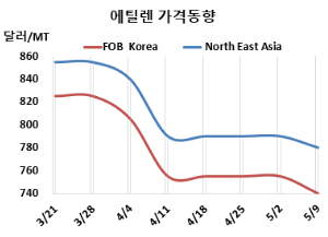 에틸렌 시세는 5월9일 CFR NE Asia가 톤당 780달러로 10달러 하락했고, CFR SE Asia는 870달러로 변동이 없었다. FOB Korea는 740달러로 15달러 떨어졌다.
