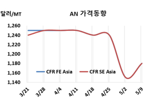 AN(Acrylonitrile)은 급락했다. AN 시세는 5월9일 CFR FE Asia 1180달러, CFR SE Asia도 1180달러로 각각 30달러 상승했다. CFR S Asia는 1130달러로 변동이 없었다. 유럽은 CIF MED 1480달러로 10달러 하락했다. 지난주 급락세를 뒤로 하 |