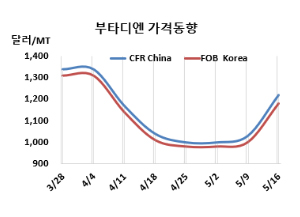 부타디엔(Butadiene)은 폭등했다. 부타디엔 시세는 5월16일 FOB Korea가 톤당 1180달러, CFR SE Asia는 1120달러로 각각 180달러 폭등했다. 중화권도 CFR China는 1220달러로 190달러, CFR Taiwan은 1180달러로 170달러 상승했다. |