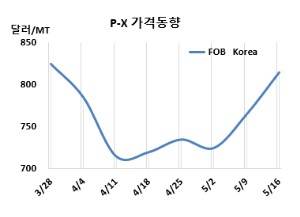 P-X(Para-Xylene)는 상승했다. P-X 시세는 5월16일 FOB Korea가 톤당 815달러, CFR SE Asia는 835달러로 각각 50달러 상승했다. CFR Taiwan은 830달러로 45달러 올랐다. 유럽은 FOB Rotterdam 830달러로 40달러 올랐다. FOB Korea는 3월28일 825달러를 형성한 |