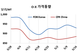 O-X(Ortho-Xylene)는 등락이 엇갈렸다. O-X 시세는 5월16일 FOB Korea가 톤당 930달러로 15달러 하락한 반면, CFR SE Asia는 895달러로 10달러 상승했다. CFR China는 885달러로 10달러 올랐다. 유럽은 FOB Rotterdam 1110달러로 20달러 하락했 |