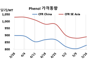 페놀(Phenol)은 상승했다. 페놀 시세는 5월16일 CFR China가 톤당 830달러로 25달러, CFR SE Asia는 890달러로 10달러 상승했다. |