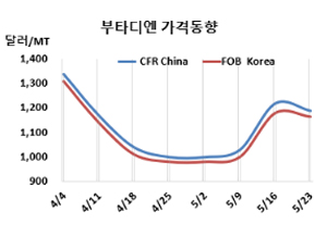 부타디엔(Butadiene)은 하락했다. 부타디엔 시세는 5월23일 FOB Korea가 톤당 1165달러로 15달러, CFR SE Asia는 1100달러로 20달러 하락했다. 중화권도 CFR China는 1190달러로 30달러, CFR Taiwan은 1170달러로 10달러 떨어졌다. |