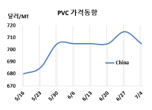 PVC(Polyvinyl Chloride)는 하락했다. PVC 시세는 7월2일 CFR China가 톤당 705달러, CFR SE Asia는 685달러로 각각 10달러 하락했다. CFR India는 710달러로 35달러 떨어졌다. 유럽은 7월4일 FD NWE가 865유로로 5유로, 미 |