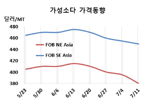 가성소다(Caustic Soda)는 하락했다. 가성소다 시세는 7월11일 FOB NE Asia가 톤당 380달러로 15달러, CFR SE Asia는 450달러로 5달러 하락했다. |