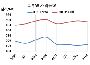 톨루엔(Toluene)은 상승했다. 톨루엔 시세는 7월18일 FOB Korea가 톤당 665달러로 10달러 상승했고, CFR SE Asia는 720달러로 변동이 없었다. CFR China는 680달러로 15달러, CFR India는 745달러로 10달러 올랐다. |