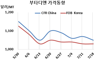 부타디엔(Butadiene)은 상승했다. 부타디엔 시세는 7월25일 FOB Korea가 톤당 1050달러, CFR SE Asia는 950달러로 각각 20달러 상승했다. 중화권은 CFR China는 1100달러, CFR Taiwan도 1100달러로 각각 50달러 올랐다. |