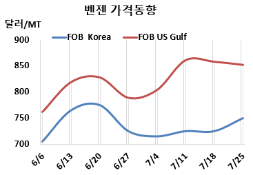 벤젠 시세는 7월25일 FOB Korea가 톤당 750달러로 25달러, CFR SE Asia는 740달러로 25달러, CFR India는 755달러로 20달러 상승했다. CFR China는 765달러로 20달러, CFR Taiwan은 765달러로 30달러 올랐다.