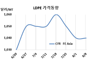 LDPE 시세는 8월6일 CFR FE Asia가 톤당 1040달러, CFR SE Asia는 1095달러로 변동이 없었다. CFR India도 1155달러로 보합세에 그쳤다. 유럽 역시 8월8일 FD NWE 1090유로로 변동이 없었다.