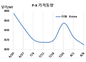 P-X(Para-Xylene)는 하락했다. P-X 시세는 8월8일 FOB Korea가 톤당 810달러, CFR SE Asia는 830달러로 각각 15달러 하락했다. CFR Taiwan도 830달러로 15달러 떨어졌다. 유럽은 FOB Rotterdam 850달러로 15달러 하락했다. |