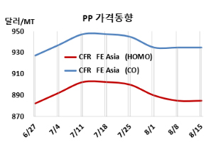 PP(Polypropylene)는 인디아가 하락했다. 아시아 PP 시세는 8월6일 CFR FE Asia 기준 라피아(Raffia) 및 인젝션(Injection) 그레이드가 톤당 885달러, IPP Film은 930달러, BOPP는 905달러, 블록 코폴리머(Block Copolymer)는 935달러로 변동이 없었다. CFR SE Asia |
