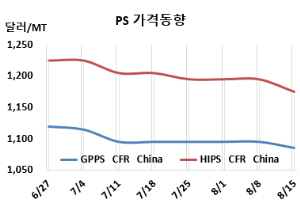 PS(Polystyrene)는 하락했다. GPPS(General Purpose PS) 시세는 8월13일 CFR China가 1085달러로 10달러 하락했지만, CFR SE Asia는 1105달러로 변동이 없었다. CFR India는 1100달러로 10달러 떨어졌다. CFR China는 2021년 |