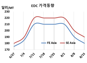 EDC(Ethlyene Dichloride)는 하락했다. EDC 시세는 8월15일 CFR FE Asia가 톤당 180달러, CFR SE Asia는 190달러로 10달러 하락했다. 유럽은 FOB NWE가 95달러로 변동이 없었다. |