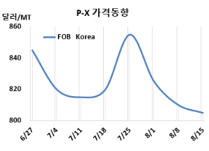 P-X(Para-Xylene)는 하락했다. P-X 시세는 8월15일 FOB Korea가 톤당 805달러, CFR SE Asia는 825달러로 각각 5달러 하락했다. CFR Taiwan도 825달러로 5달러 떨어졌다. 반면, 유럽은 FOB Rotterdam 855달러로 5달러 상승했다. |