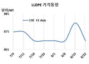 LLDPE(Linear Low-Density Polyethylene)는 하락했다. LLDPE 시세는 8월20일 CFR FE Asia가 톤당 870달러로 10달러 하락했고, CFR SE Asia는 950달러로 변동이 없었다. CFR India는 925달러로 10달러 하락했다. 유럽은 8월22일 FD NWE 970유로로 20유로 떨어졌 |