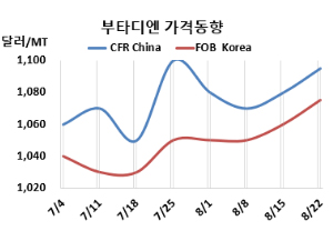 부타디엔(Butadiene)은 상승했다. 부타디엔 시세는 8월22일 FOB Korea가 톤당 1075달러로 15달러, CFR SE Asia는 980달러로 20달러 상승했다. 중화권은 CFR China는 1095달러, CFR Taiwan은 1090달러로 각각 15달러 올랐다. |
