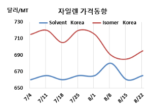 M-X(Mixed-Xylene)는 상승했다. 용제(Solvent) 그레이드 M-X 시세는 8월22일 FOB Korea가 톤당 665달러로 5달러, CFR SE Asia는 735달러로 10달러 상승했다. CFR China는 715달러로 5달러 올랐고, CFR India는 755달러로 변동이 없었다. |