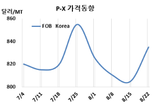 P-X 시세는 8월22일 FOB Korea가 톤당 835달러, CFR SE Asia는 855달러로 각각 30달러 상승했다. CFR Taiwan도 855달러로 30달러 올랐다. 유럽 역시 FOB Rotterdam 885달러로 30달러 올랐다.