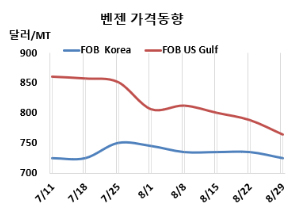 벤젠(Benzene)은 하락했다. 벤젠 시세는 8월29일 FOB Korea가 톤당 725달러로 10달러, CFR SE Asia는 715달러로 10달러, CFR India는 730달러로 15달러 하락했다. CFR China는 740달러로 15달러, CFR Taiwan은 735달러로 10달러 떨어졌다. |