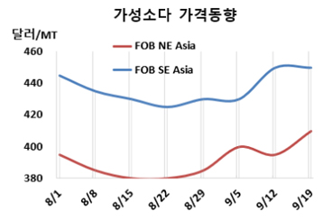 가성소다 시세는 9월19일 FOB NE Asia가 톤당 410달러로 1