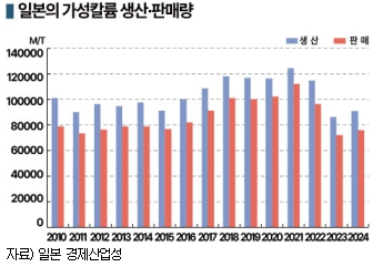 일본 경제산업성에 따르면, 가성칼륨 생산량은 2024년 9만798톤으로 전년대비 5.6% 증가했고, 판매량 역시 7만6036톤으로 5.4% 늘었으나 생산·판매 모두 기준선인 10만톤을 넘지 못했다.