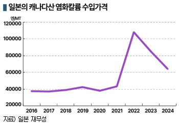 캐나다산 염화칼륨 수입가격은 2022년 시장 혼란을 틈타 톤당 10만엔대로 사상 최고치를 기록했으나 2023년에는 러시아 제재국과 비제재국으로 수입처 분화가 진행되며 8만엔대로 하락했고, 2024년에는 6만엔대로 안정됐다.