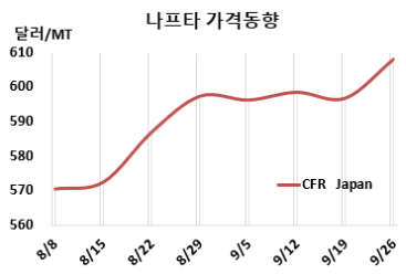 나프타(Naphtha)는 상승했다. 나프타 시세는 9월26일 기준 CFR Japan 톤당 608달러로 약 11달러 상승했다. |