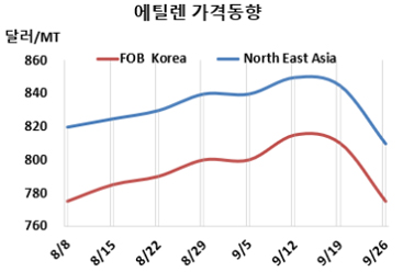 에틸렌(Ethylene)은 하락했다. 에틸렌 시세는 9월26일 CFR NE Asia가 톤당 810달러로 35달러, CFR SE Asia도 81 |