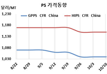 GPPS, CFR S Asia 1030달러로 20달러 하락 … 원료 SM은 보합세