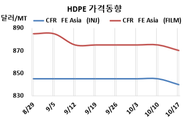 CFR S Asia는 인젝션 875달러로 10달러, 블로우몰딩 870달러로 10달러, 필름은 875달러로 15달러, 얀은 860달러로 10달러 떨어졌다. 유럽은 10월17일 인젝션이 FD NWE 톤당 900유로로 40유로, 블로우몰딩은 880유로로 50유로, 필름은 900유로로 40유로 하락했다.