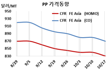 PP(Polypropylene)는 하락했다. 아시아 PP 시세는 10월15일 CFR FE Asia 기준 라피아(Raffia) 및 인젝션(Injection) 그레이드가 톤당 830달러, IPP Film은 870달러, BOPP는 845달러, 블록 코폴리머(Block C |