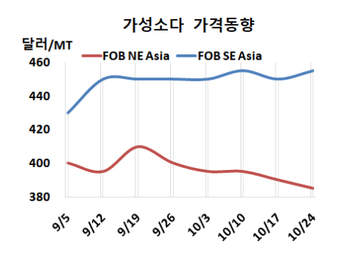가성소다 시세는 10월24일 FOB NE Asia가 톤당 385달러로 5달러 하락한 반면, CFR SE Asia는 455달러로 5달러 상승했다. 표, 그래프: <Caustic Soda 가격동향> <화학저널 2025/10/27> |