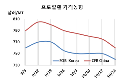 화학뉴스 2025.10.28		 프로필렌(Propylene)은  동북아가 하락했다.